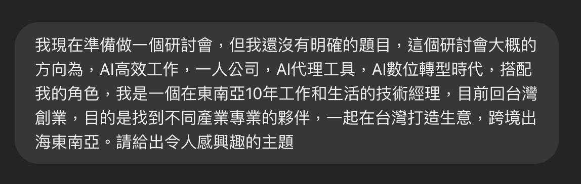 想做研討會?直播? 讓生成AI幫你搭經建骨, 完成大綱直接省掉6小時想主題+大綱結構的時間