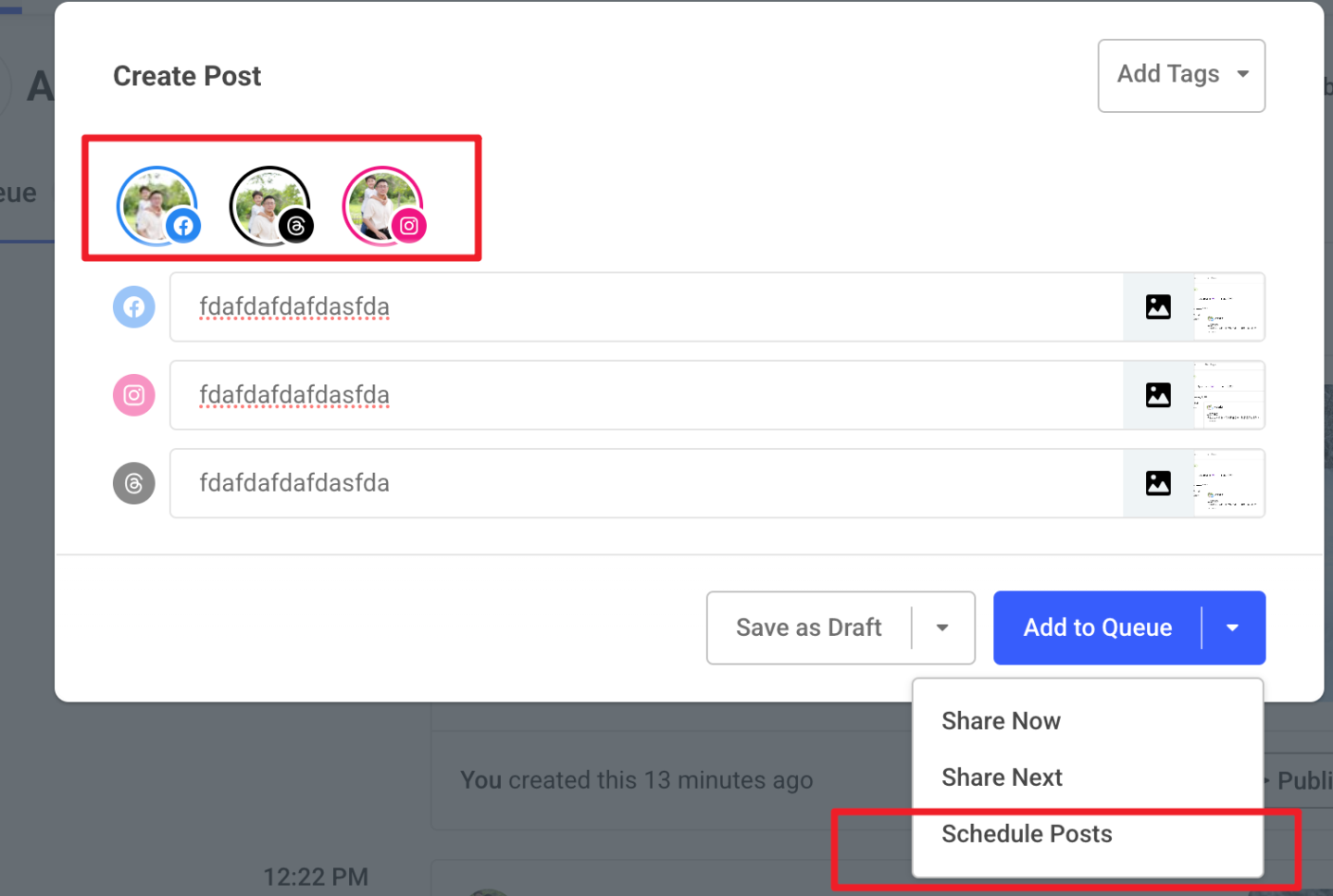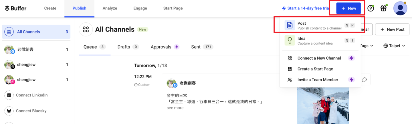 簡單來說,就是幫你把10幾篇的圖文,一次性的排程,發布到多個社交平台上,持續輸出,做功課,讓社交帳號活躍。