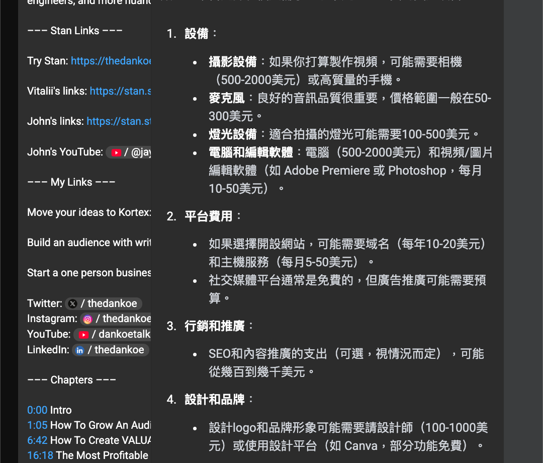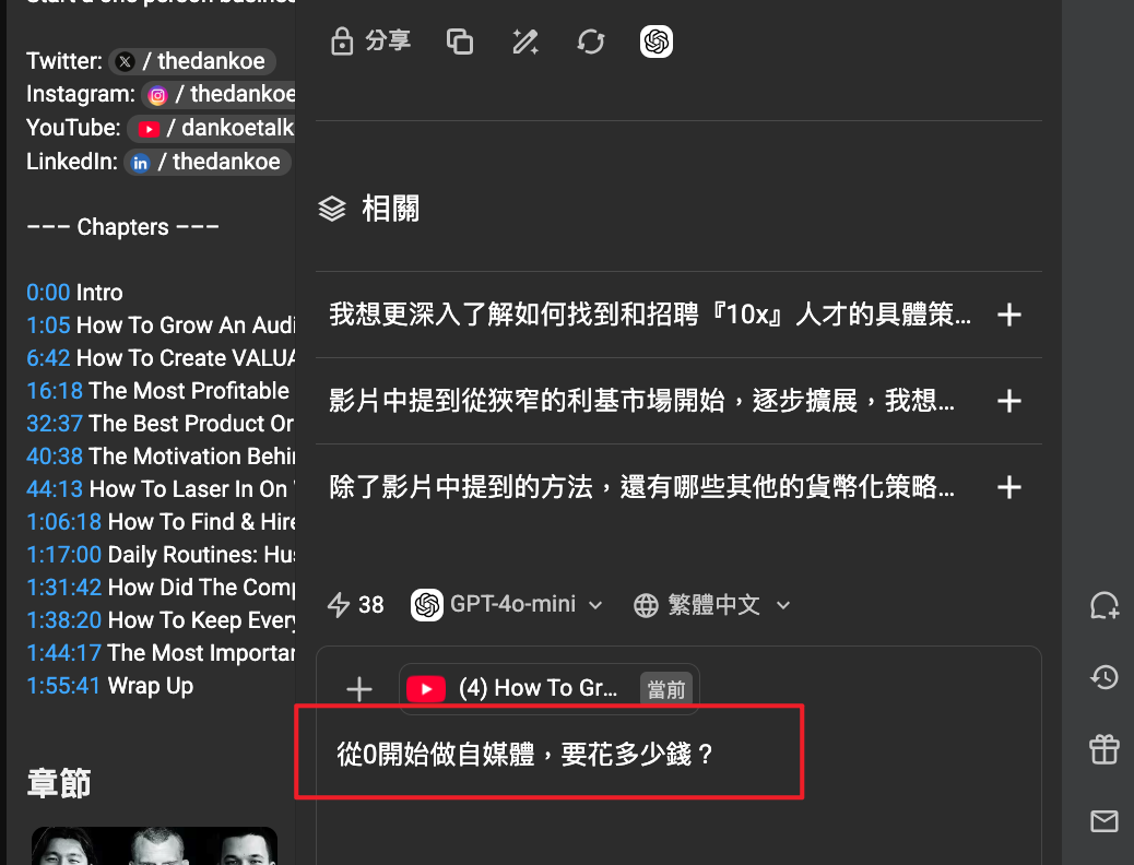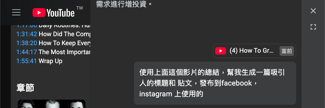 ✅ 影片,一個零散對話的過程 - AI幫你從整理排列,總結,引導問題,生成其他貼文,就1分鐘的事情