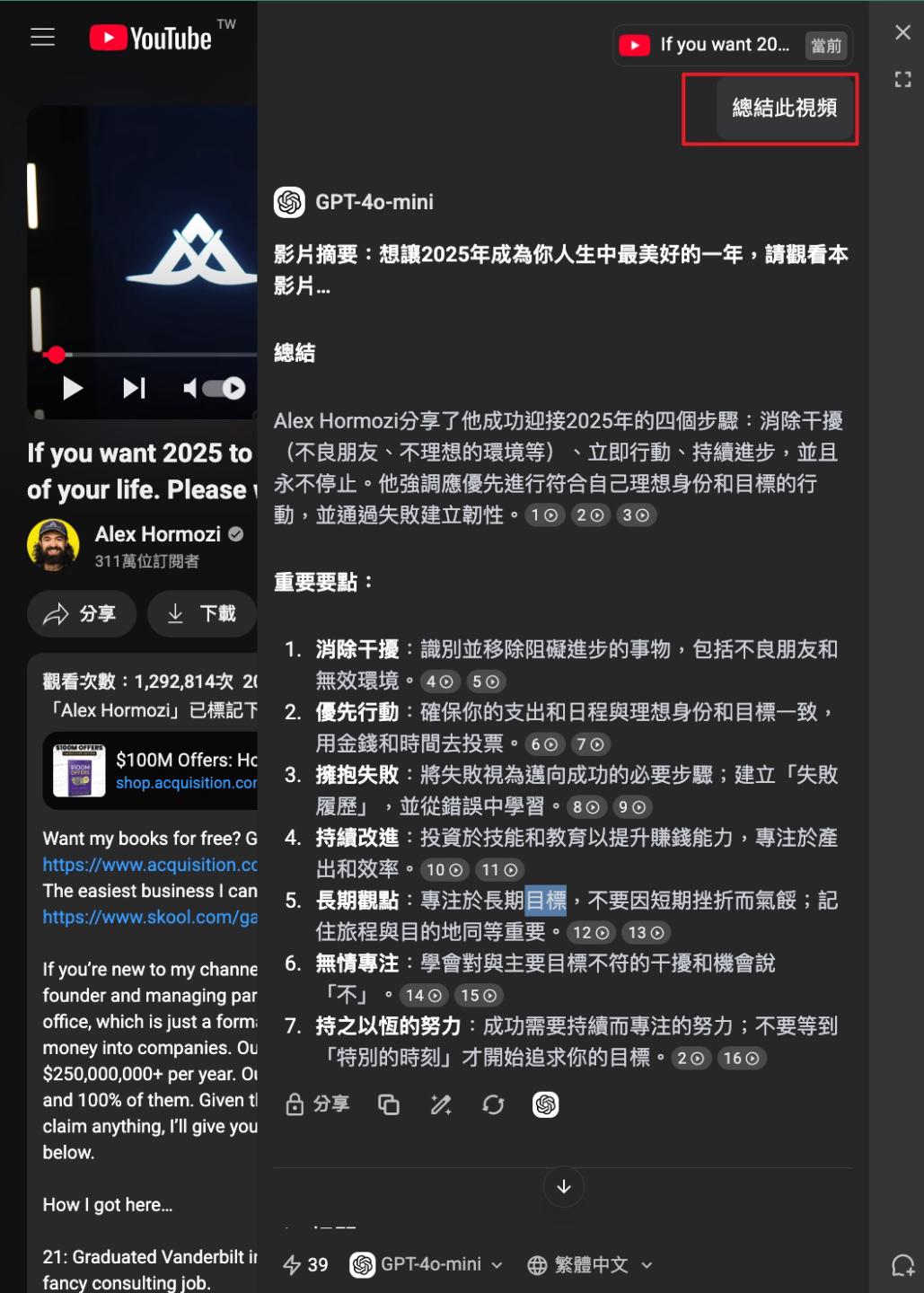 遇到的痛點:當我們 遇到問題時候,或是開始建構一項新的知識的時候,往往要查很多資料,或是看很多影片,這些影片長的2小時,短的30分鐘;但往往你需要的,可能就是1分鐘的片段解答而已。學習目標和工具: 1. 用MaxAI chrome插件 - 一分鐘總結影片下載連結:https://www.maxai.co/(輕量免費)